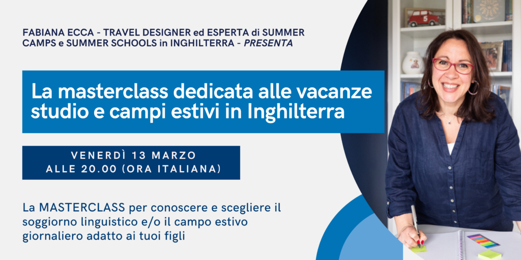 Se vuoi restare aggiornata/o sui prossimi webinar e masterclass dedicati alle vacanze studio e ai campi estivi, anche giornalieri, in Inghilterra, ti invito a seguirmi sulla mia pagina Eventbrite oppure puoi visualizzare la mia offerta di consulenze sul mio sito www.fabianaecca.com. Se sei particolarmente interessato a questa realtà e vuoi sapere il nominativo della scuola e ricevere il mio codice sconto che potrai utilizzare quando prenoterai in autonomia tramite il loro sito internet, ti invito a compilare questo modulo, ti contatterò nel più breve tempo possibile.